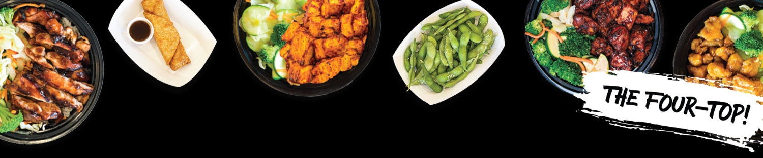 Includes a 4 bowl combination of your choice from: Regular Sized Chicken Teriyaki, Spicy Chicken, Orange Chicken or Spicy Tofu. Plus, your choice of 2 appetizers from: Chicken Eggroll or Edamame. Each regular sized bowl also comes with White or Brown Rice and Stir-Fry Veggies.